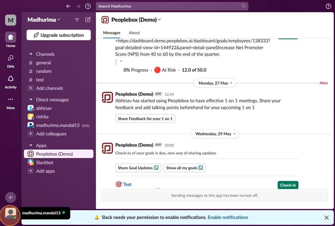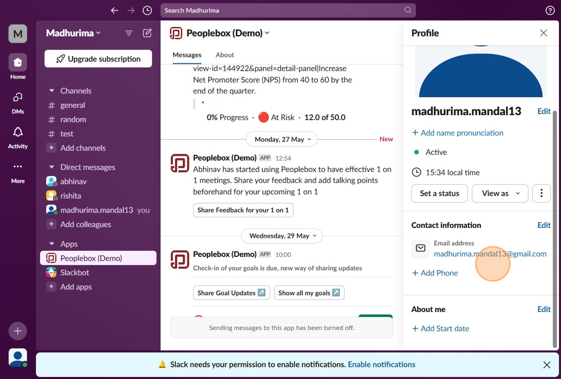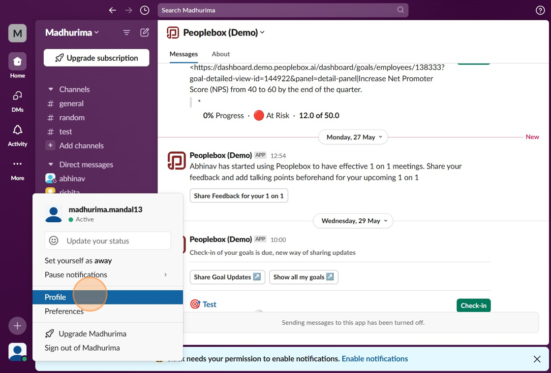 If you didn't get a notification for your performance review in Slack, mostly it would be because your email address in Slack and email address in our system is different. Here is how you can find your slack email address: