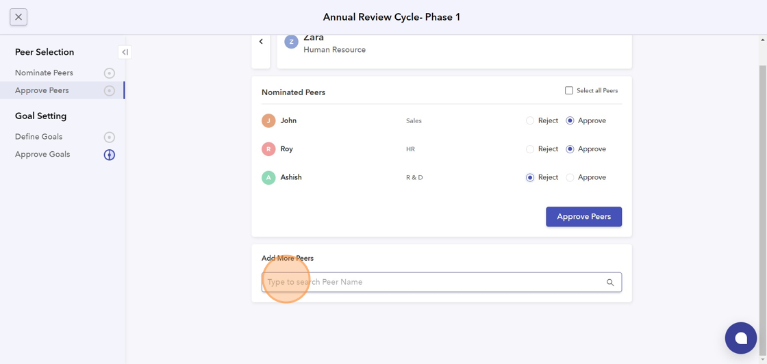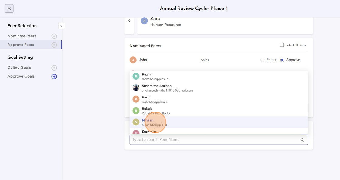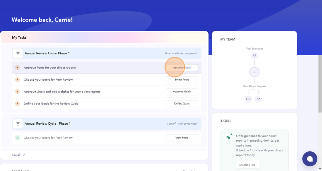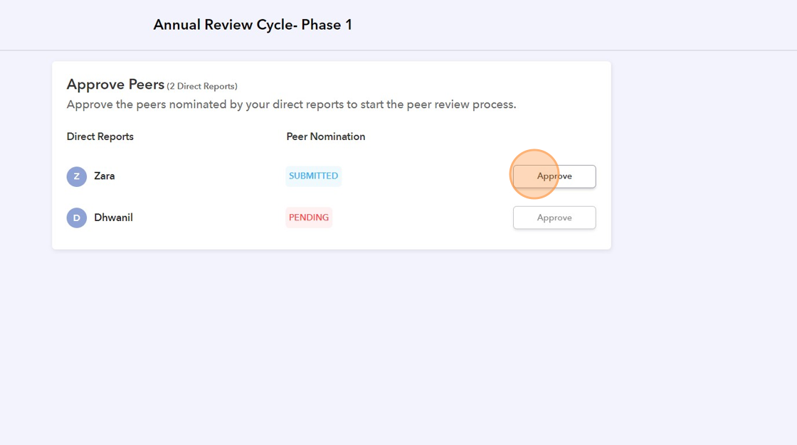 - You'd see all your direct reports who are part of the review cycle. Click on "Approve".