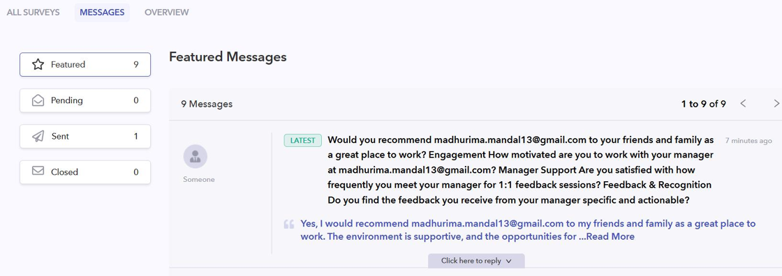 To reply, go to the dropdown labeled "Click here to reply" below each message. You can either choose your reply from the suggestions given or type your own reply.