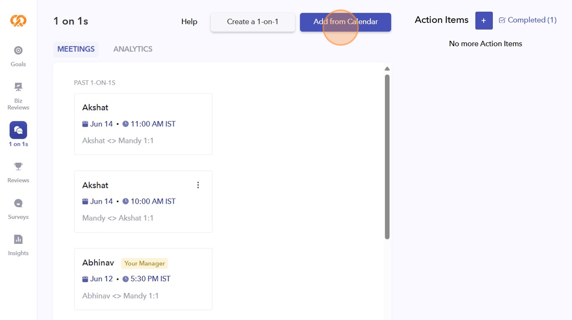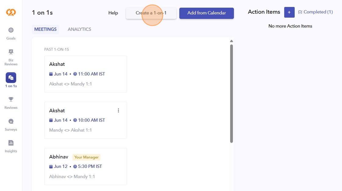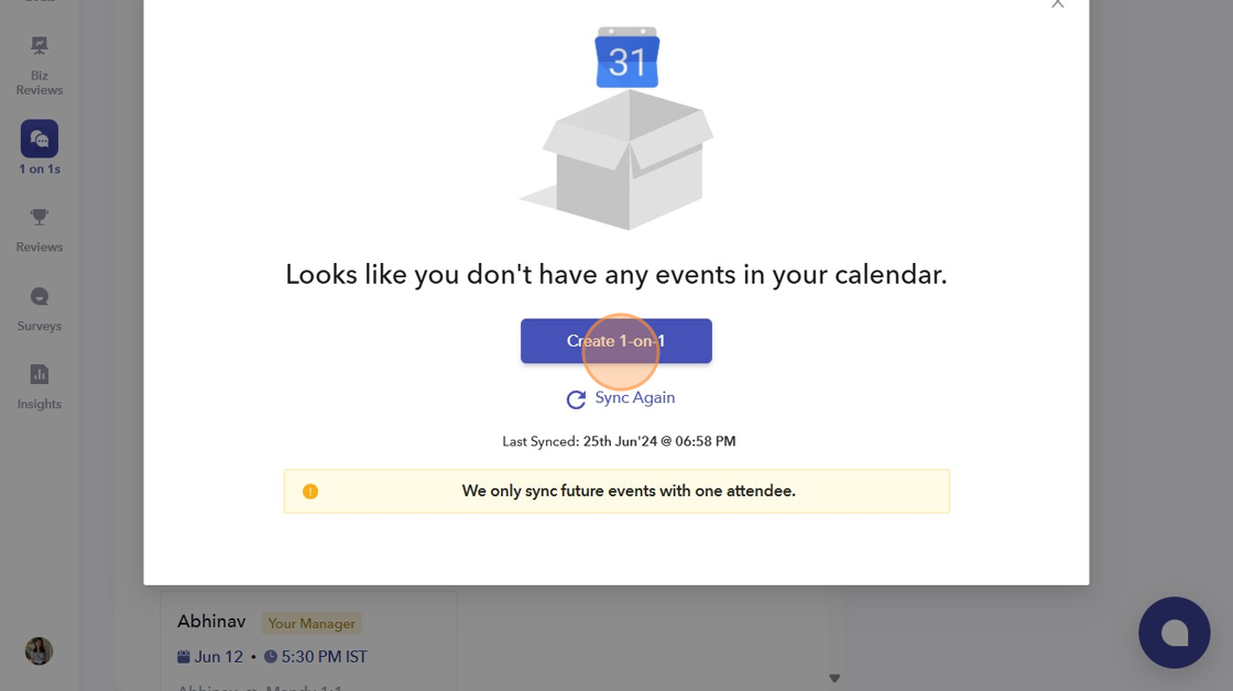 - After syncing your calendar, all the 1-on-1s will automatically appear on the tool. However, if no 1-on-1s are scheduled, you can create one from here.