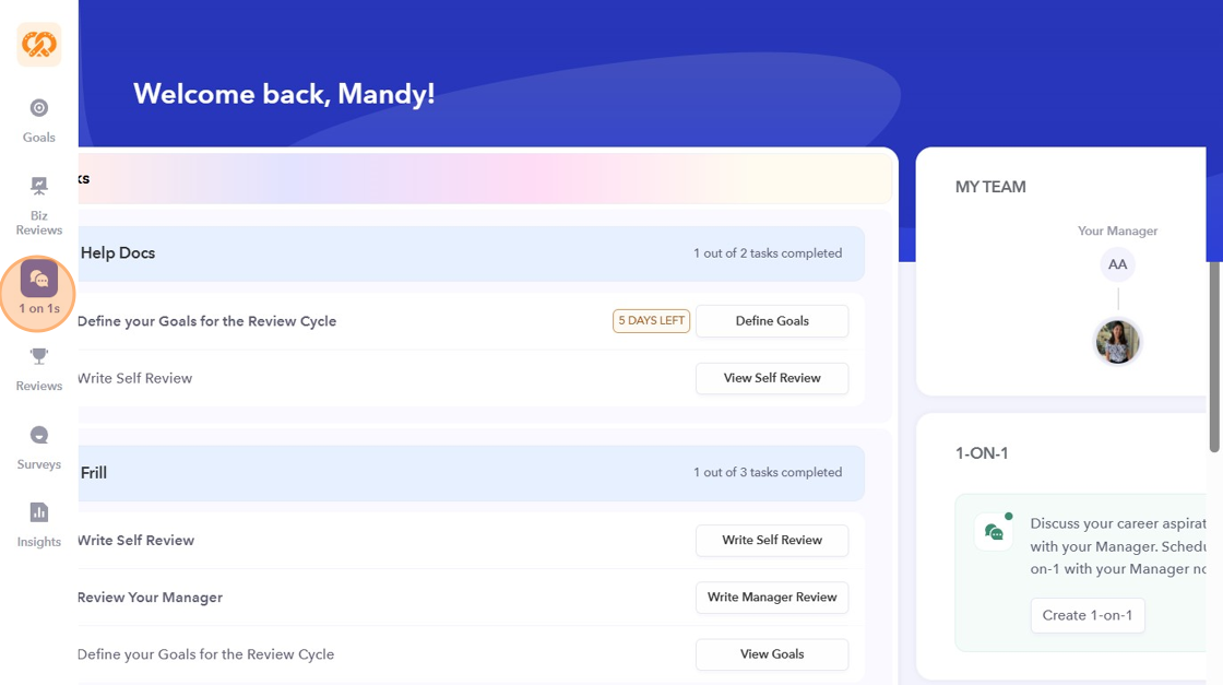 - On the left sidebar of your dashboard, click on the "1 on 1s" icon.