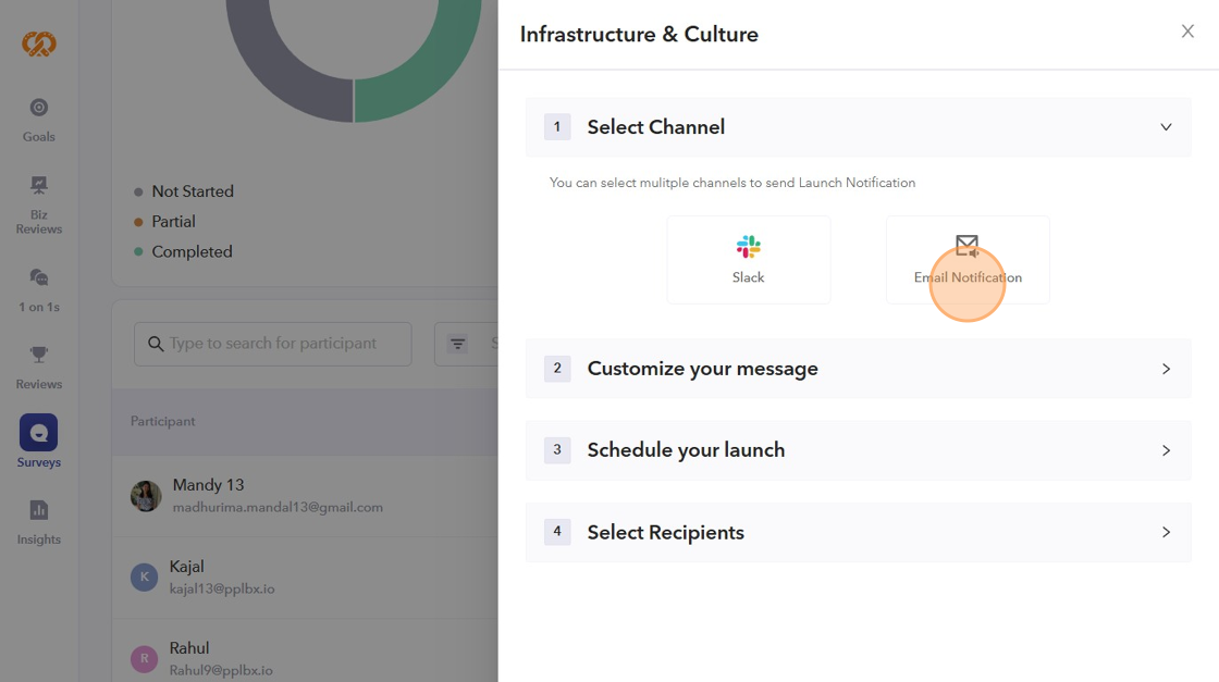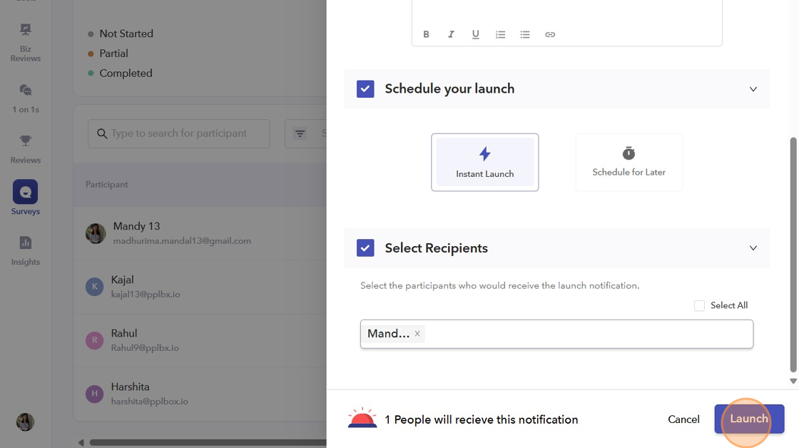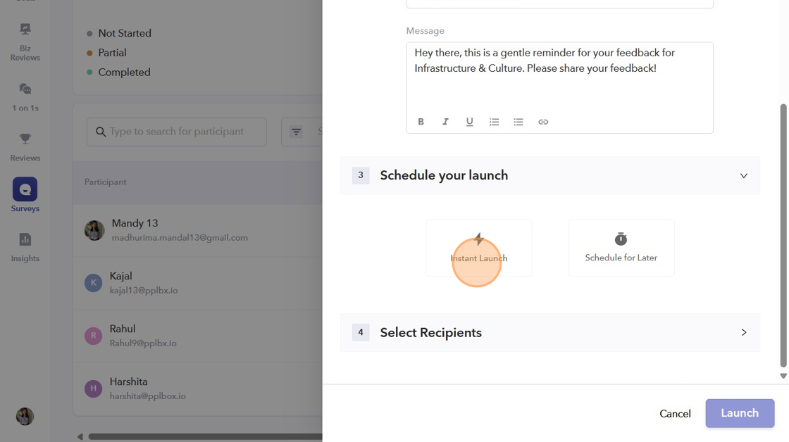 - After selecting the recipients, click "Launch," and the reminder will be sent to the participants according to your scheduled launch.