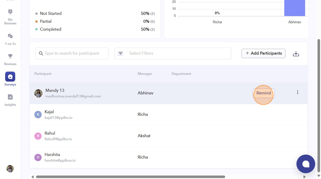 - Select the participant you want to send a reminder to, and then click the "Remind" button.