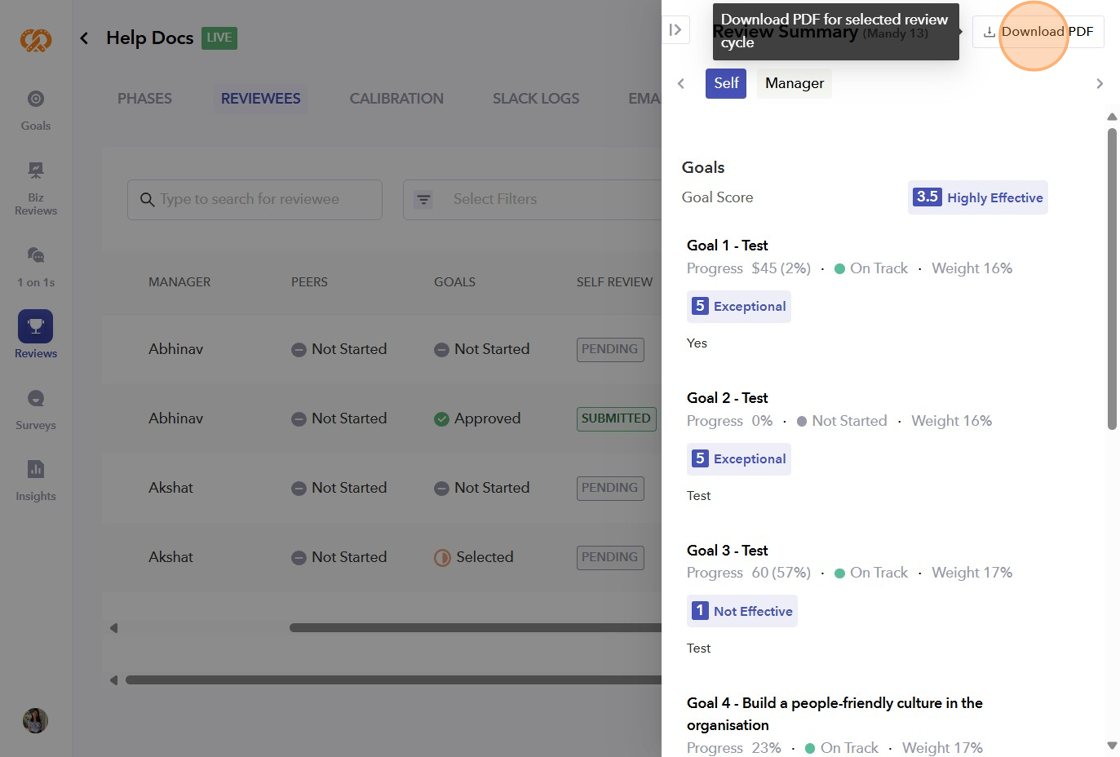 - Click the "Download PDF" button to generate a PDF containing all the data for that specific Reviewee.