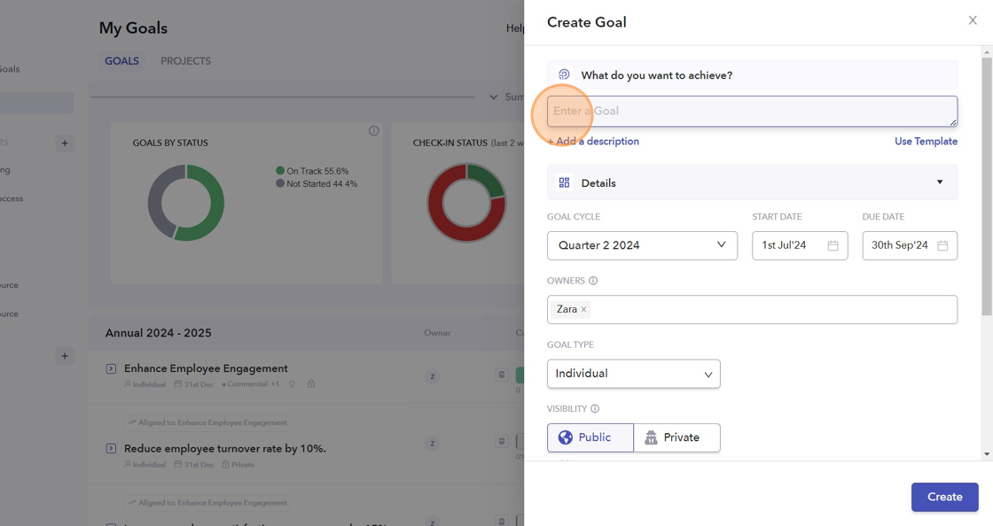 - Click on this textbox to enter a Goal.