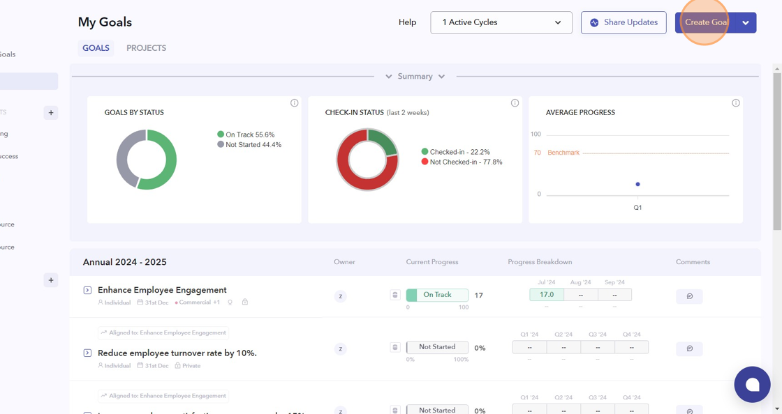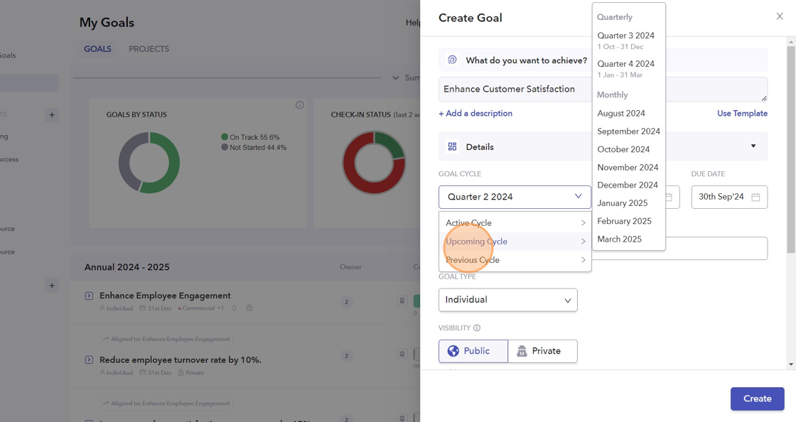 - Click here to set the Goal Cycle. You can choose from Active, Upcoming, or Previous cycles.
