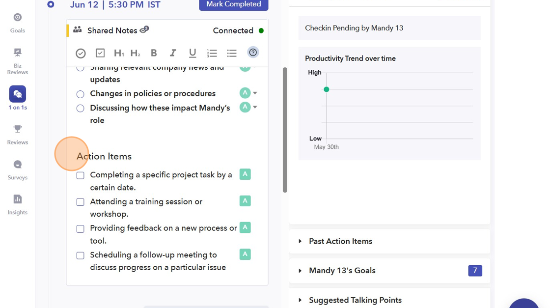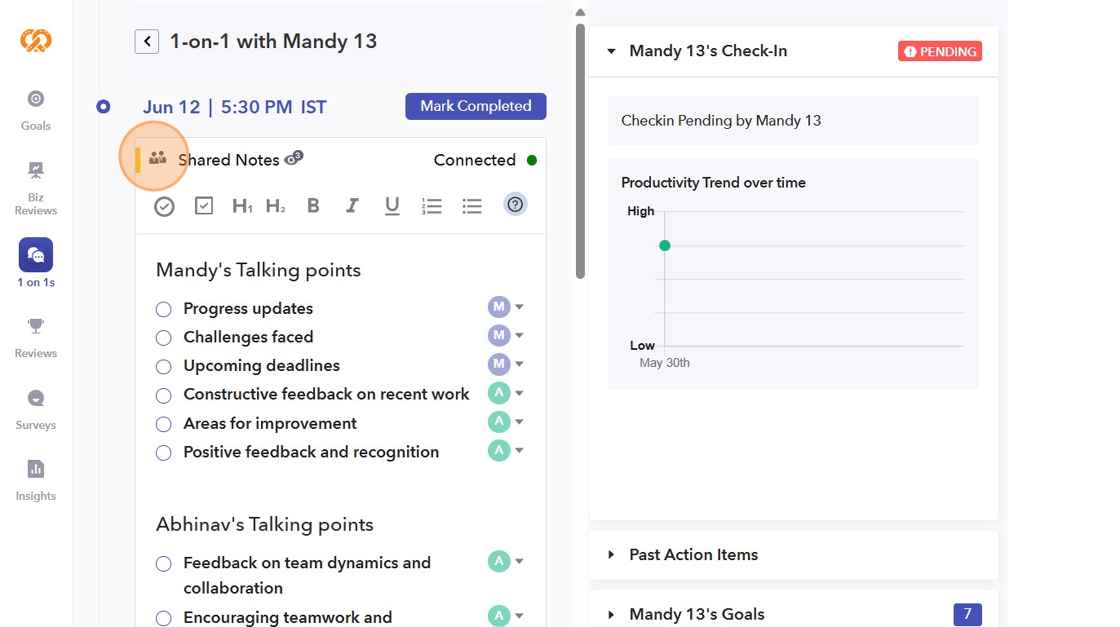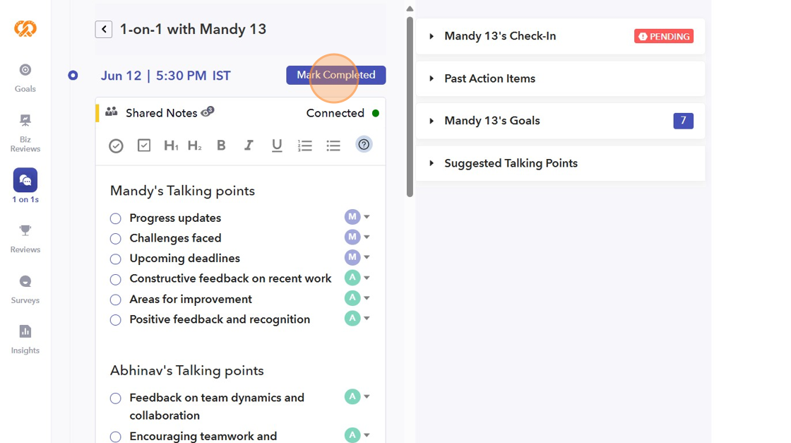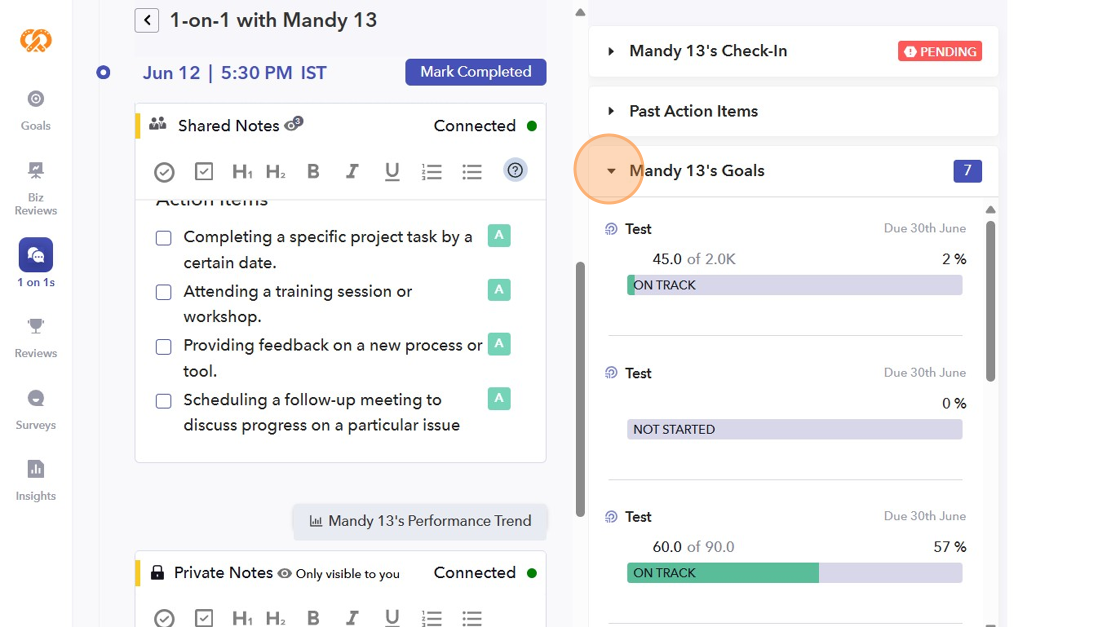 - You can view and track the goals of the person you are having 1-on-1s with.