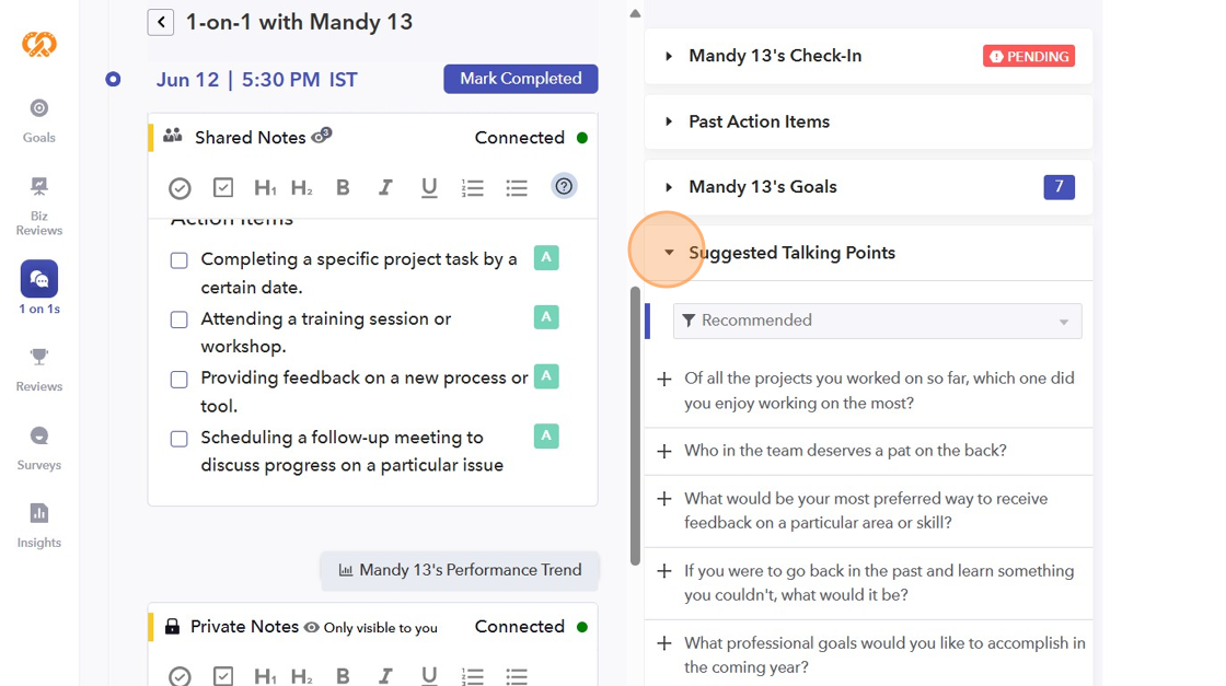 - You can add your private notes to the 1-on-1s that will be visible only to you.