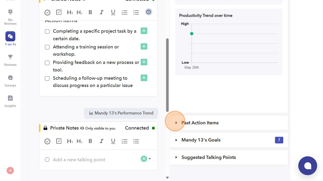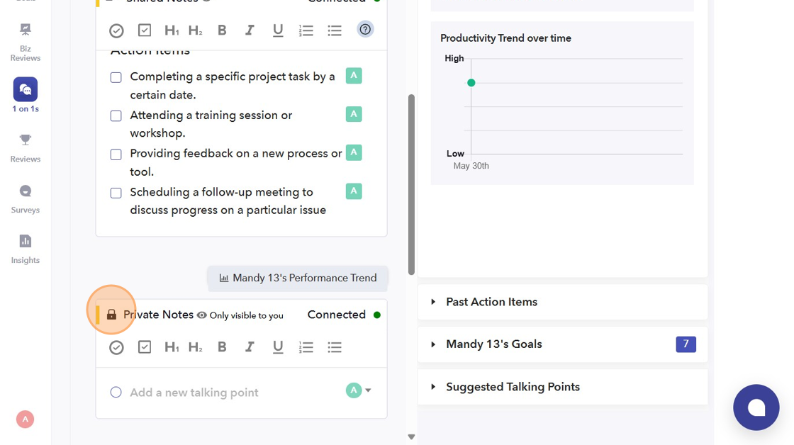 - You and the person you're having the 1-on-1 with can share notes that are only visible to you both and the admin.