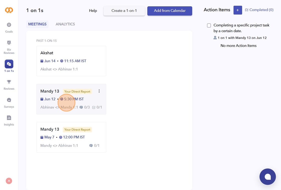- On the left sidebar of your dashboard, click on the "1 on 1s" icon.
