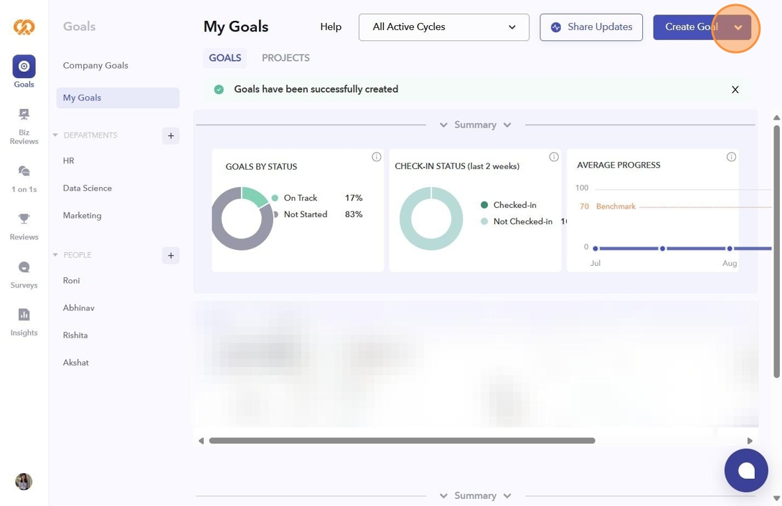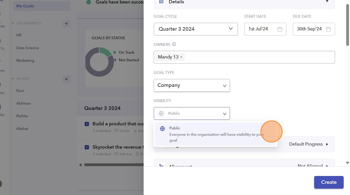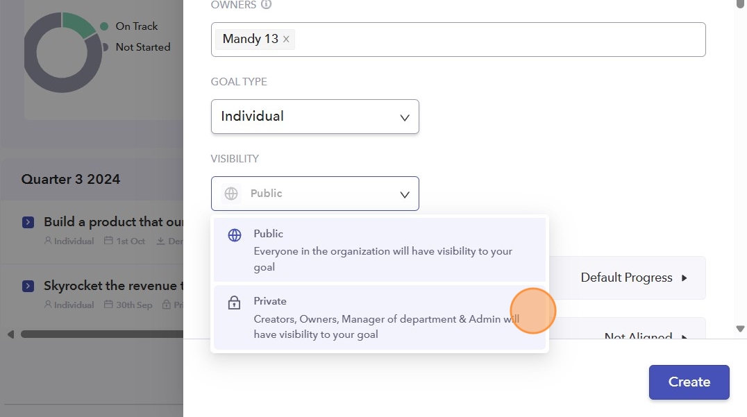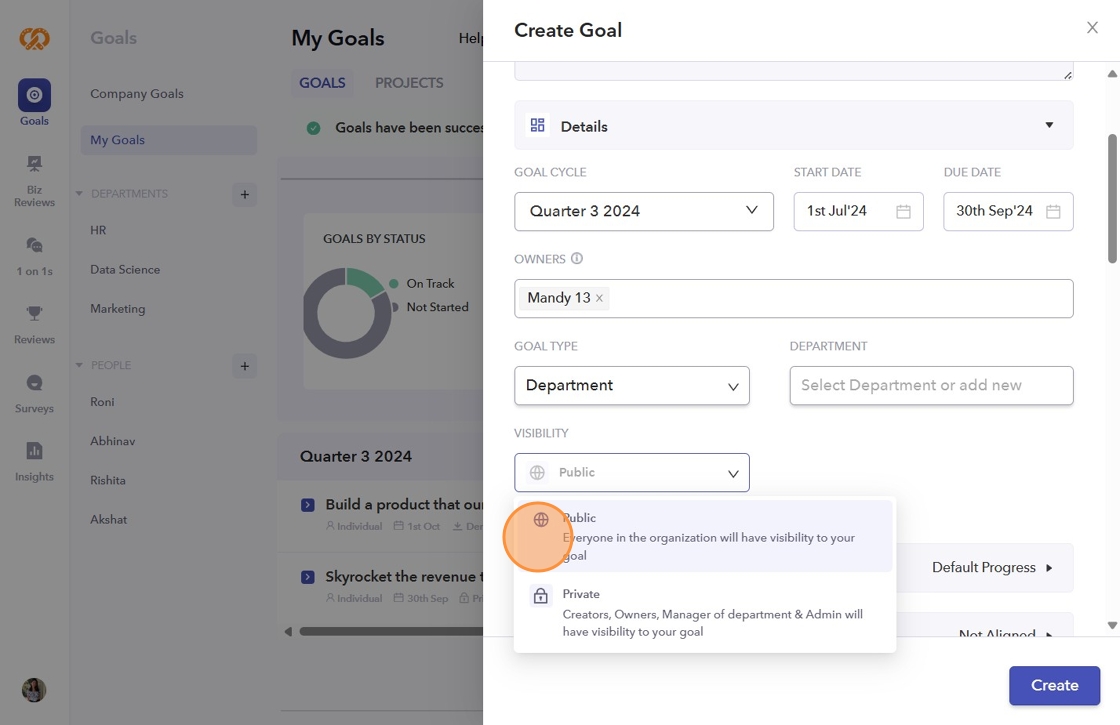 Private: Only creators, owners, managers of the departments, and admins will have visibility of your goal.