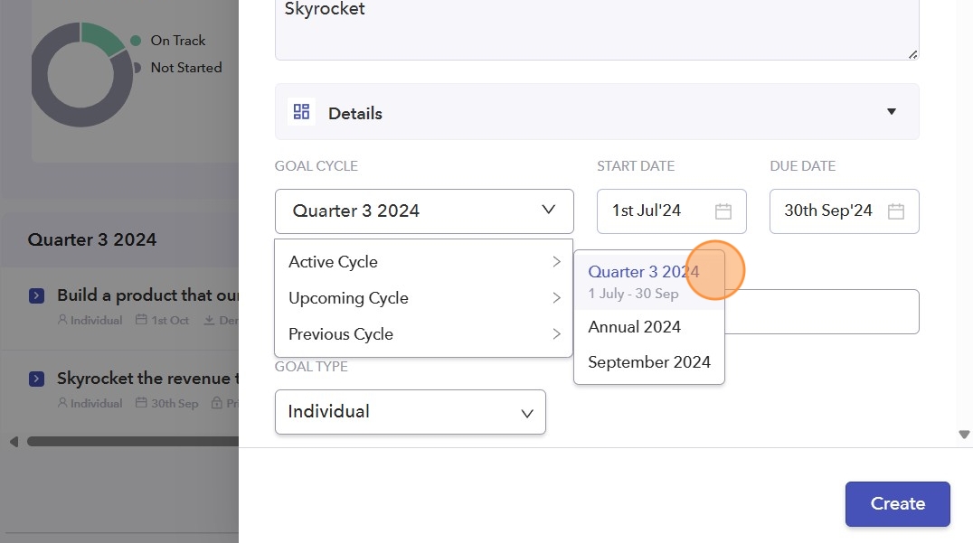 - Choose the cycle for which you are creating the goal. It should either be annual, or a Quarter Cycle. By default, the start and end dates will be based on the selected cycle, but you can change them if needed. The end date must fall within the chosen cycle.